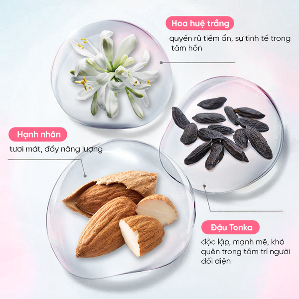 - Hương giữa : Hoa nhài, hoa huệ trắng