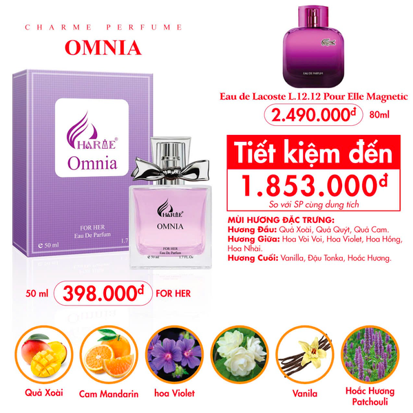 Mở đầu, hương trái cây tạo nên nét hương tích cực và tươi mát giòn tan đầy tinh tế. Làn hương ở tầng giữa đặc trưng của nó bao phủ chai nước hoa và thêm sống động hơn với nét quyến rũ tự nhiên của hoa hồng và hơi sương trong trẻo của hoa violet cùng sự quyến rũ của hoa nhài. Tầng hương cuối lưu lại khoảnh khắc dịu êm bao phủ bởi vanilla và hoắc hương, đậu tonka ấm áp càng làm “đóa hoa” Charme Omnia trở nên nồng nàn và xinh đẹp hơn, làm người dùng nhớ mãi không thôi.