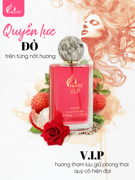 Bạn sẽ thấy được sắc đỏ bao trùm trọn cả một hành trình tiếp xúc, tạo nên một dấu ấn riêng vừa mạnh mẽ lại vô cùng quyến rũ của người phụ nữ quyền lực. Mở đầu cho hương thơm là một màn kết hợp ấn tượng đến từ quả lý chua đỏ mọng nước mang trong mình những nét hoang dã cùng với trái vải nhiệt đới quen thuộc. Một tầng hương đầu hoàn hảo với vị chua ngọt thanh tao nhẹ nhàng làm toát lên vẻ nữ tính và tươi sáng của các cô gái. Tầng hương chìa khóa của chai nước hoa Charme V.I.P chỉ có độc duy nhất một nguyên liệu, đó là hoa hồng nhung. Tuy nhiên tập trung khắc sâu được nét duyên dáng nhưng cũng vô cùng sang chảnh, kiêu hãnh của một người phụ nữ hiện đại. Cuối cùng, sự trải nghiệm kết thúc bằng những nốt hương đến từ cỏ hương bài phảng phất mùi hương cỏ vetiver kết hợp cùng với vani tạo nên sự mềm mại, vương vấn trên làn da.